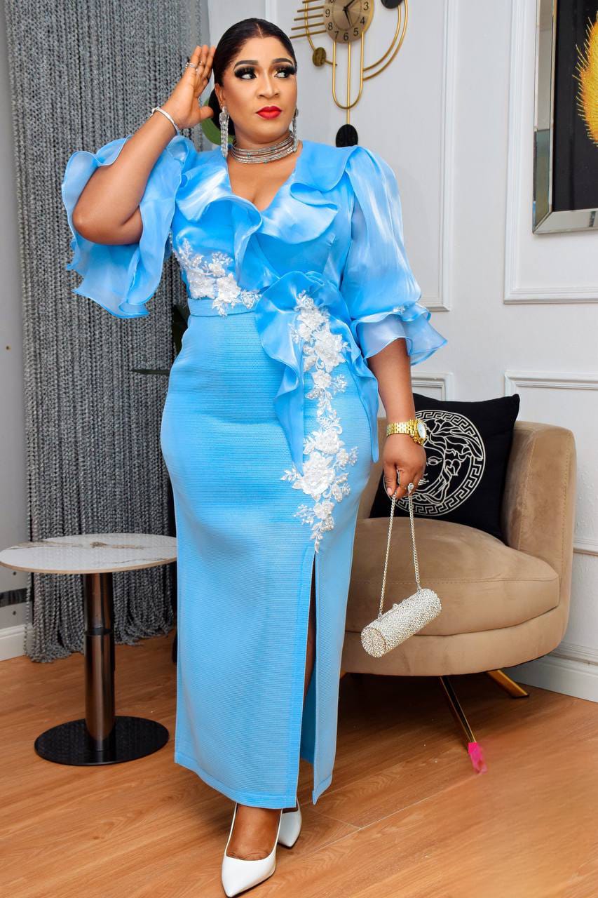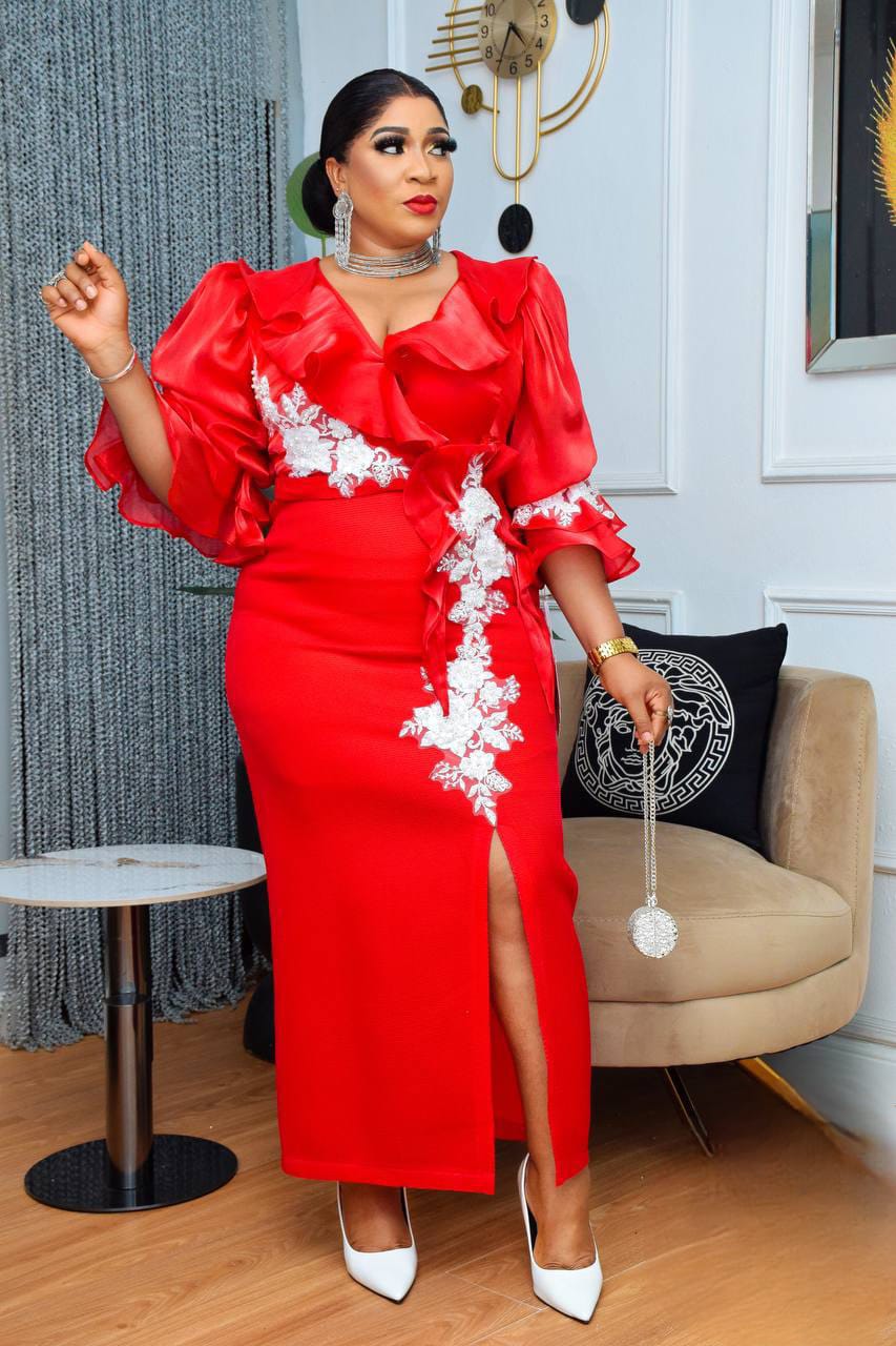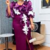 Our “Crimson Petals” Midi Dress is a beautifully tailored piece in a rich, vibrant red hue. It features a sophisticated V-neckline with delicate ruffles, which cascade elegantly across the bodice. The dress is adorned with intricate white floral embroidery that flows from the waist and up the sleeve, creating a stunning and artistic look. The form-fitting silhouette is perfectly complemented by a daring thigh-high slit, adding a modern and alluring touch.