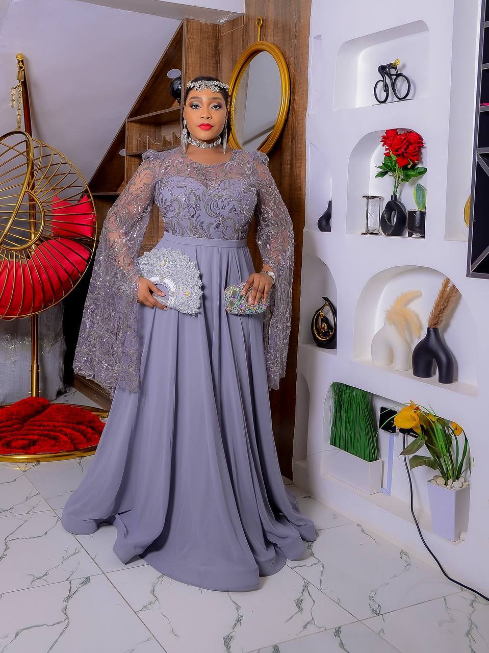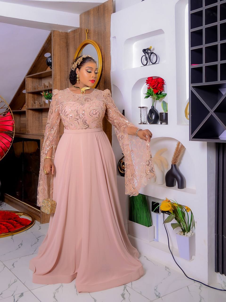 Our “Sapphire Shimmer” Peplum Set is a stunning two-piece outfit that combines a rich blue blouse with a sequined skirt. The top features a V-neckline, a pleated peplum silhouette, and a distinctive belt with a rhinestone-encrusted buckle. The sleeves have unique pleated, puffed shoulder details that add a touch of glamour. The matching skirt is a long, fitted sequin piece that shines with every movement.