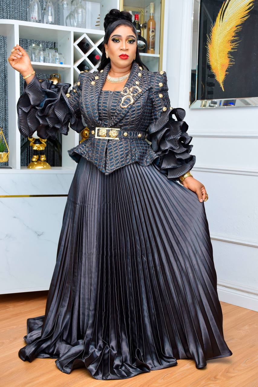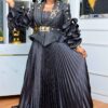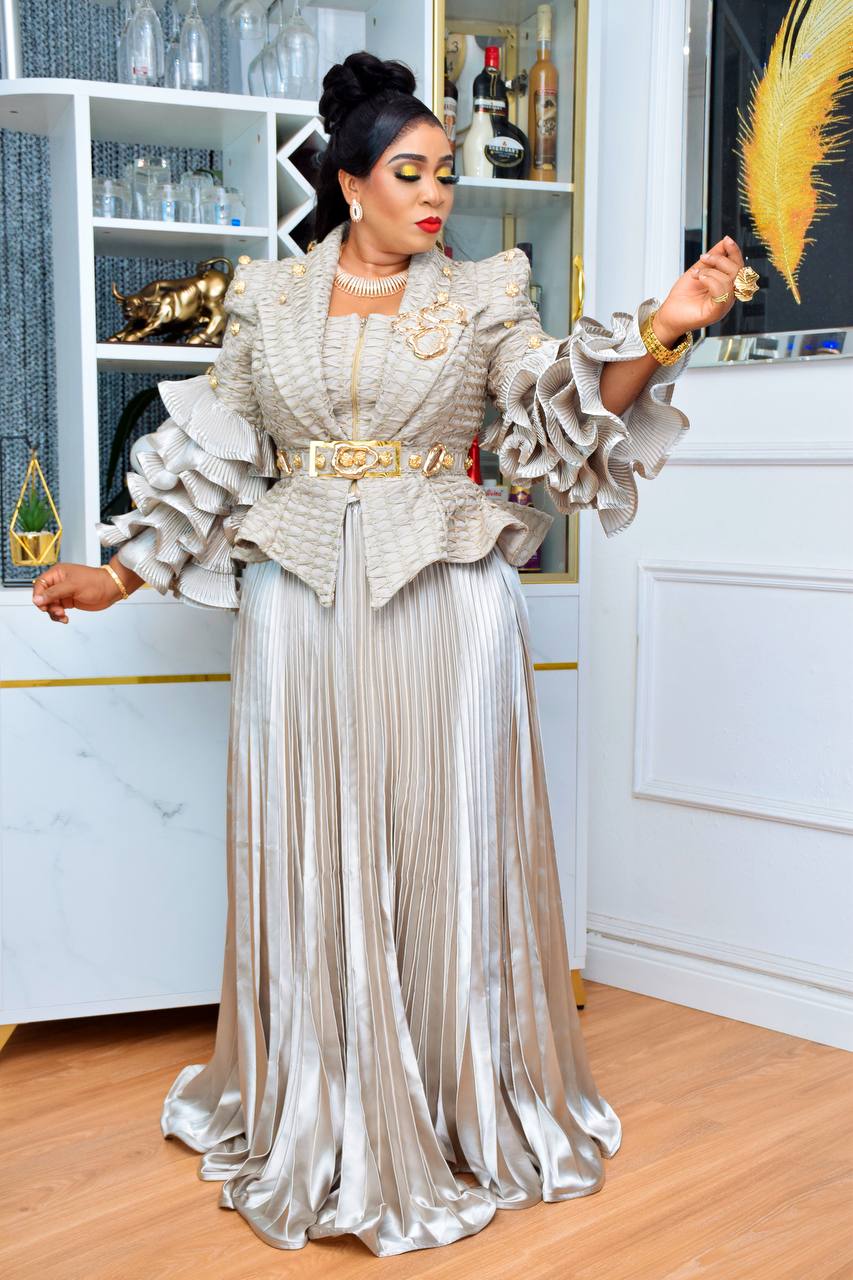 Our “Bronze Horizon A-line Gown” is a sophisticated two-piece ensemble in a beautiful, light bronze hue with a subtle texture. The top features a structured, slightly cropped jacket with a V-neckline, adorned with delicate gold embroidery on the shoulders. The three-quarter sleeves are a statement piece with multiple layers of cascading ruffles, creating a dramatic and stylish look. The jacket is cinched at the waist with a wide, ornate gold belt. The bottom is a long, flowing A-line skirt in a matching pleated fabric that adds grace and movement.
