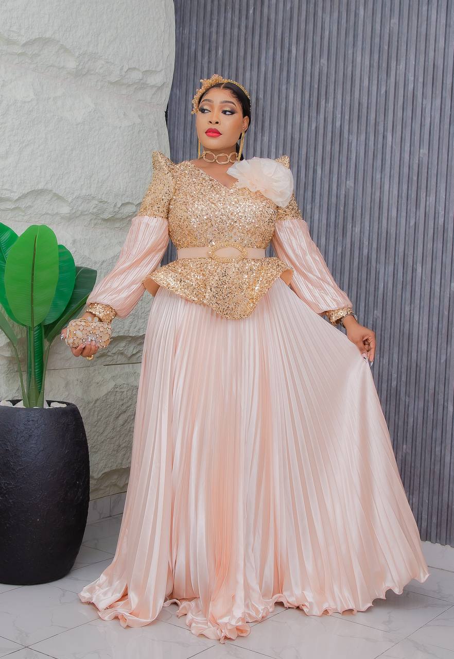 Our “Rose Gold Splendor Peplum Set” is a stunning two-piece outfit that radiates sophistication and glamour. The peplum top features exquisite gold sequin and bead embellishments, creating a dazzling and ornate pattern. It has a flattering V-neck and delicate cape-like sleeves that drape elegantly over the shoulders. The top is cinched with a wide, embellished belt featuring a striking gold sunburst design. The ensemble is completed with a pleated, flowing floor-length skirt in a soft, lustrous rose gold hue.