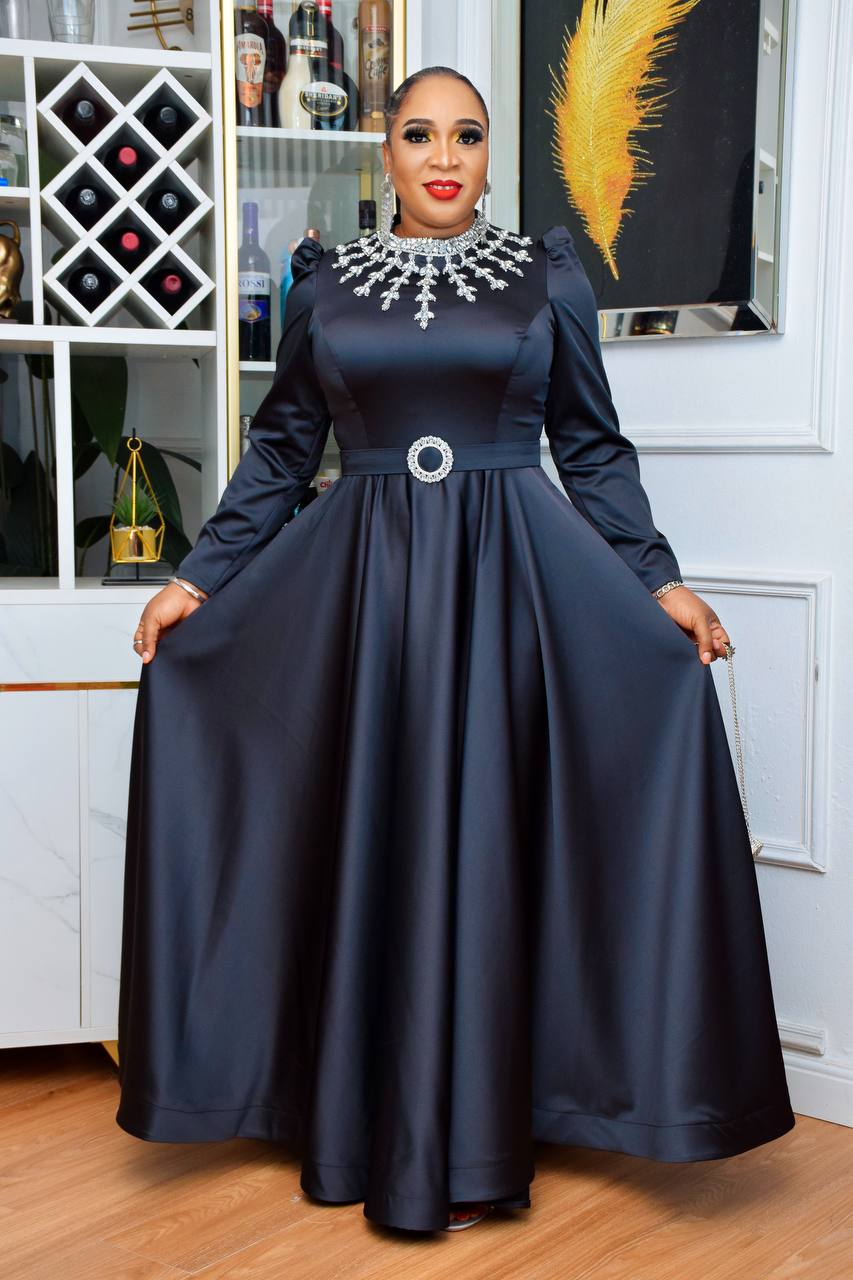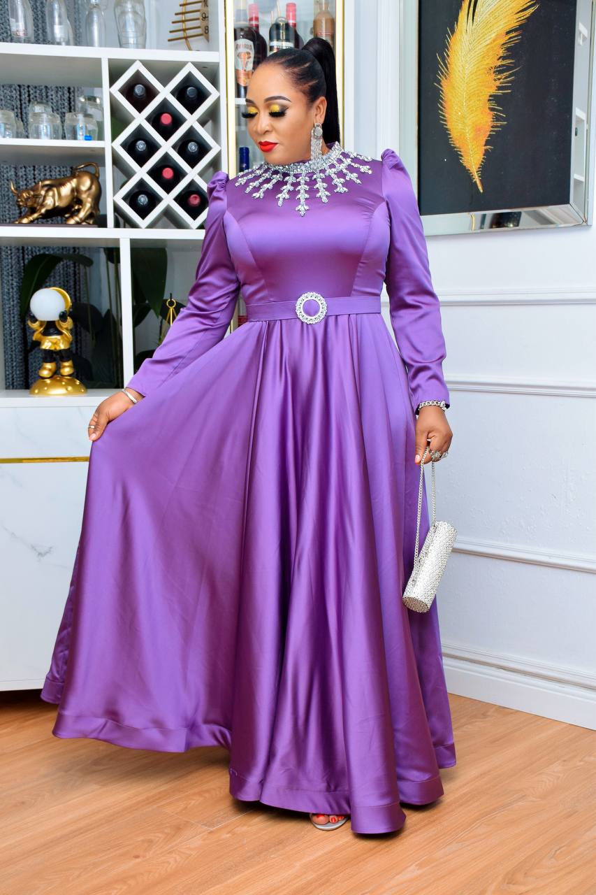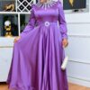 Our “Majestic Lavender A-line Gown” is a vision of timeless grace and modern style. This stunning floor-length gown features a smooth lavender fabric that drapes beautifully. The high neckline is adorned with an intricate, starburst-like silver rhinestone and bead embellishment that adds a touch of celestial glamour. The long, full sleeves are gathered at the shoulder, creating a subtle puff detail, and the waist is cinched with a matching silver-embellished belt.