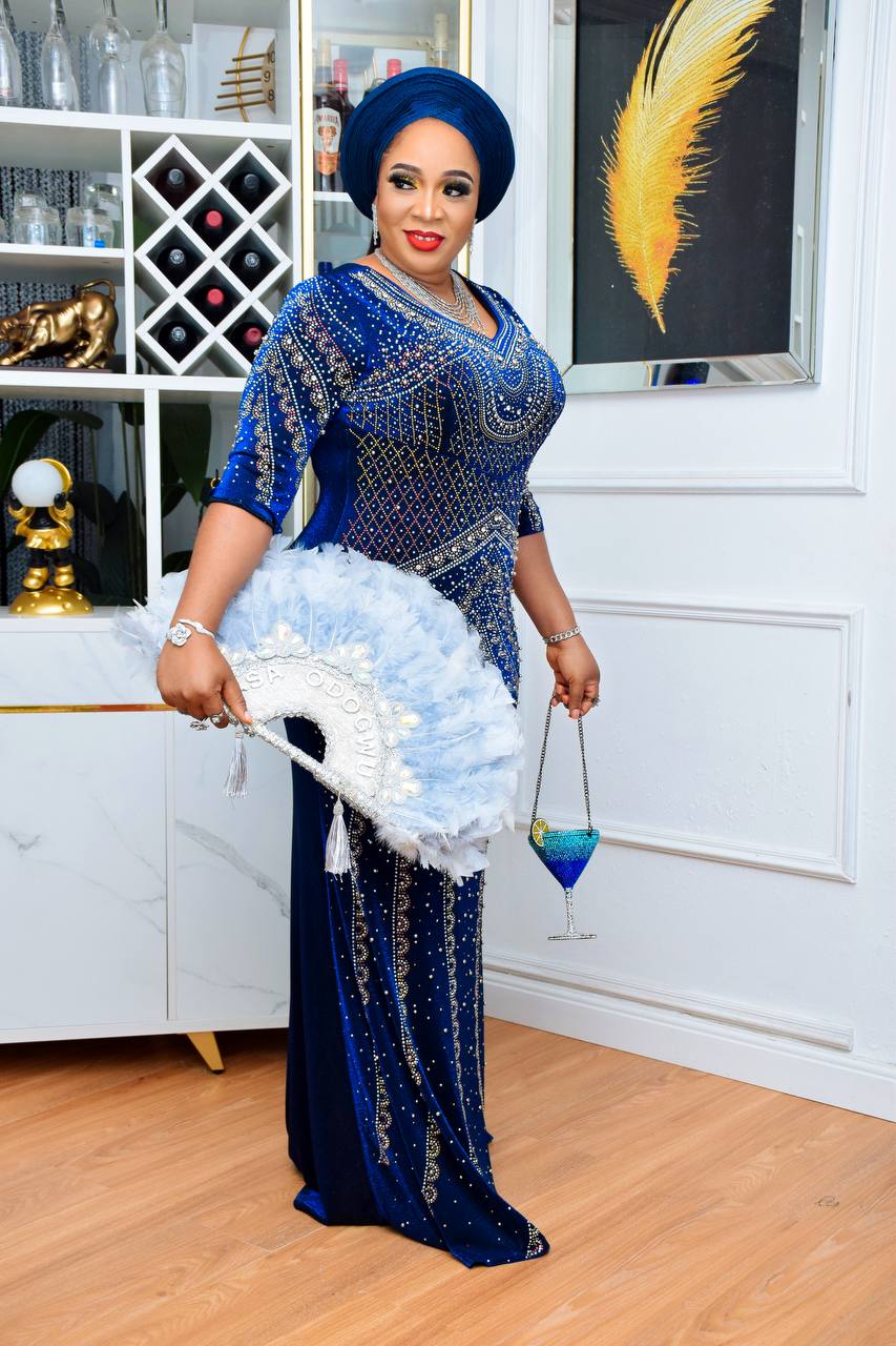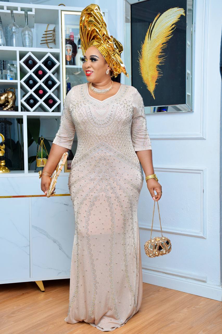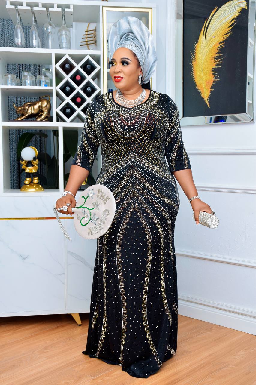 Our “Noir Majestic Beaded Gown” is a stunning floor-length dress with a striking and intricate design. This black gown is embellished with a beautiful pattern of gold and silver beads that radiate from the neckline and cascade down the length of the dress. The three-quarter sleeves feature a matching beaded design, adding to its sophisticated appeal.