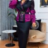 The black peplum jacket features a deep V-neckline with a crossover design, and is adorned with vibrant purple embroidery on the lapels and peplum hem. The sleeves are a showstopper, featuring layered purple accordion-pleated ruffles that create a bold, dramatic silhouette. The set is cinched at the waist with a wide black belt with a sleek gold buckle, and is paired with a matching black pencil skirt.