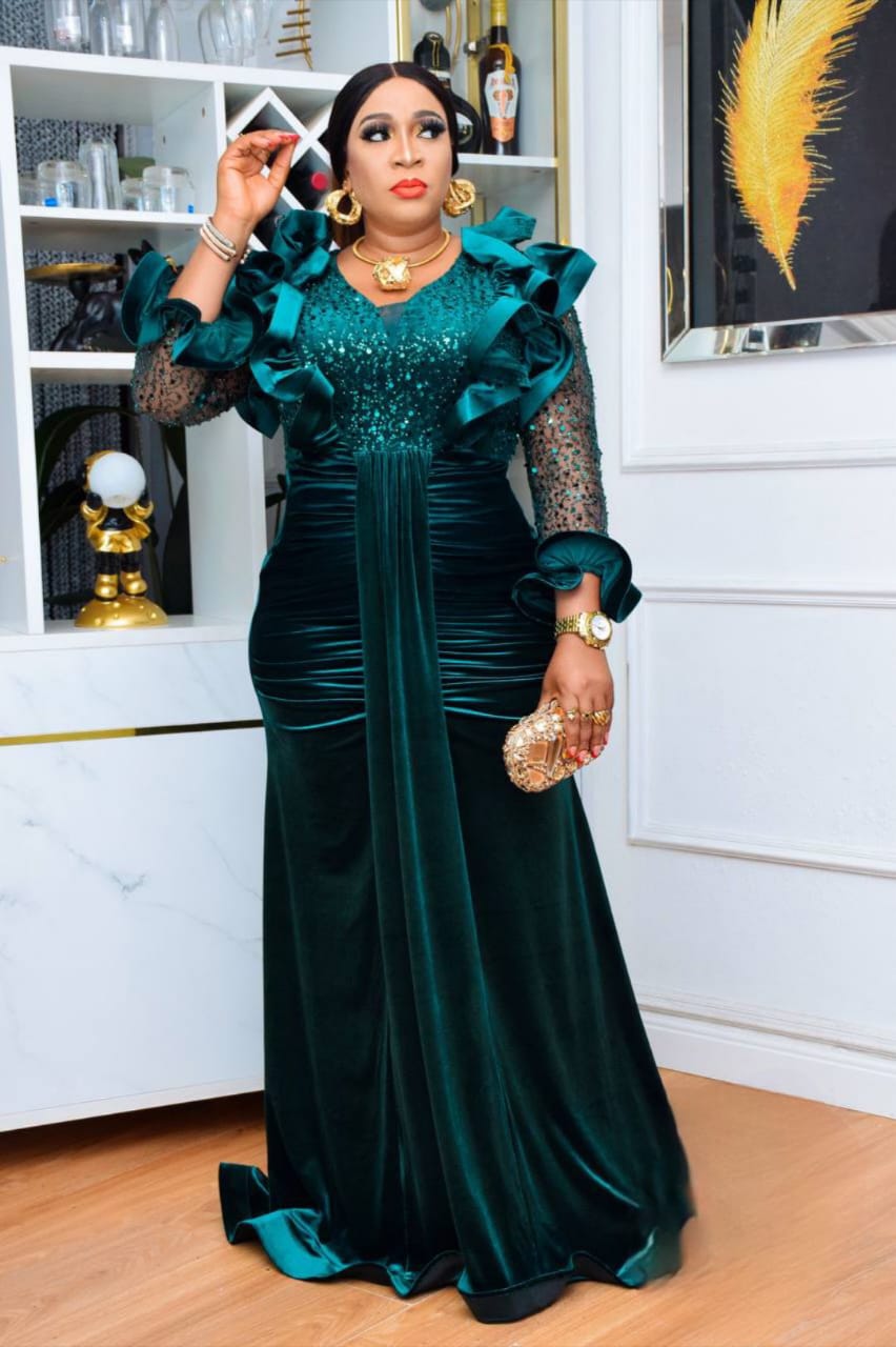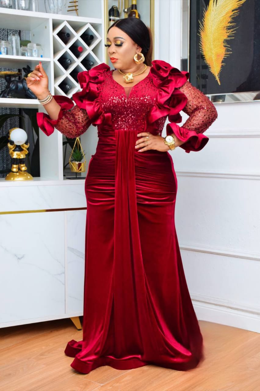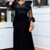 Step into the spotlight with our “Midnight Elegance” Gown. This luxurious maxi dress combines rich black velvet with a ruched and pleated skirt, creating a figure-flattering silhouette. The top features intricate sequin embellishments and dramatic, cascading ruffled sleeves with sheer, dotted detailing. The stunning mix of textures and the powerful black hue make this an instant classic for any high-end event.