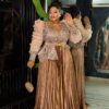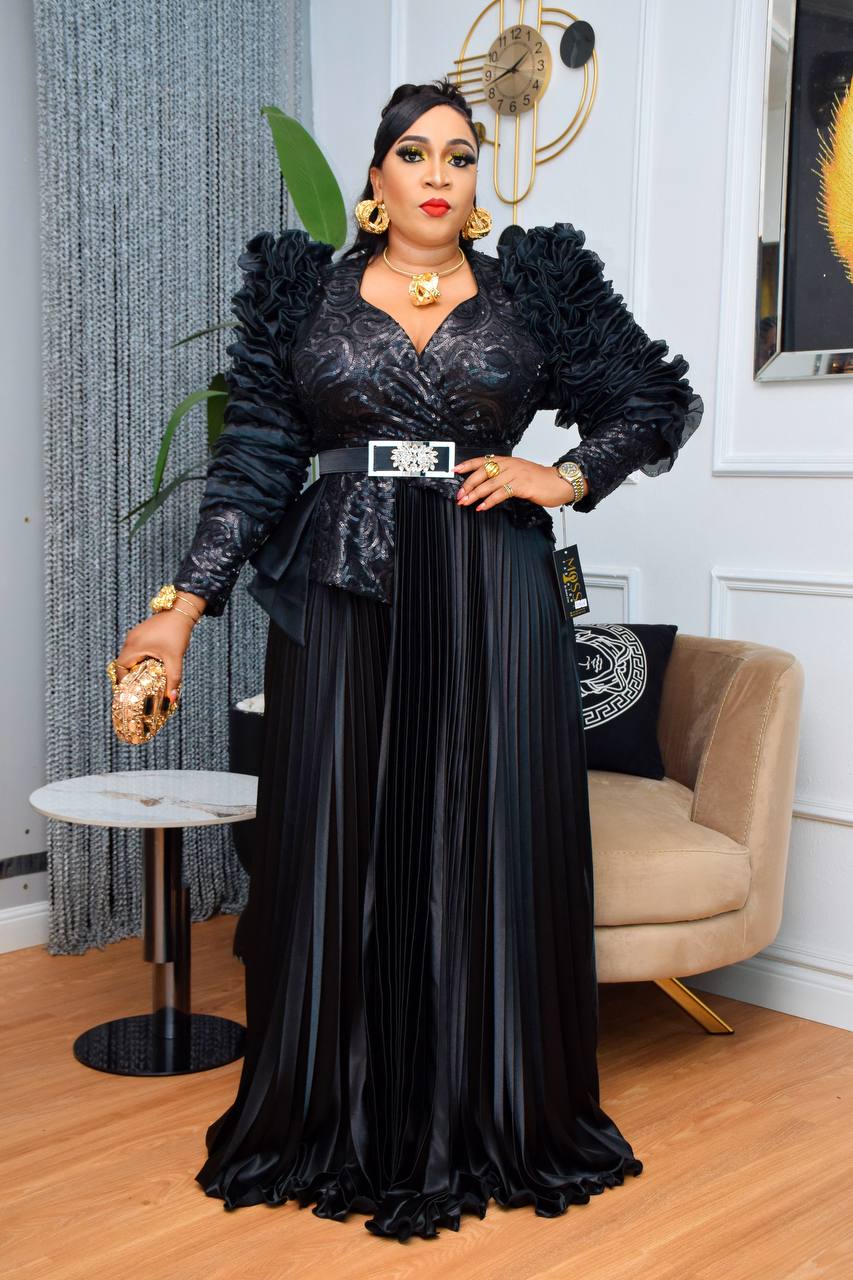 Shine with sophistication in this champagne-gold pleated gown, adorned with floral embroidery, romantic ruffled sleeves, and a luxe gold-accent belt for timeless glamour.
