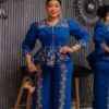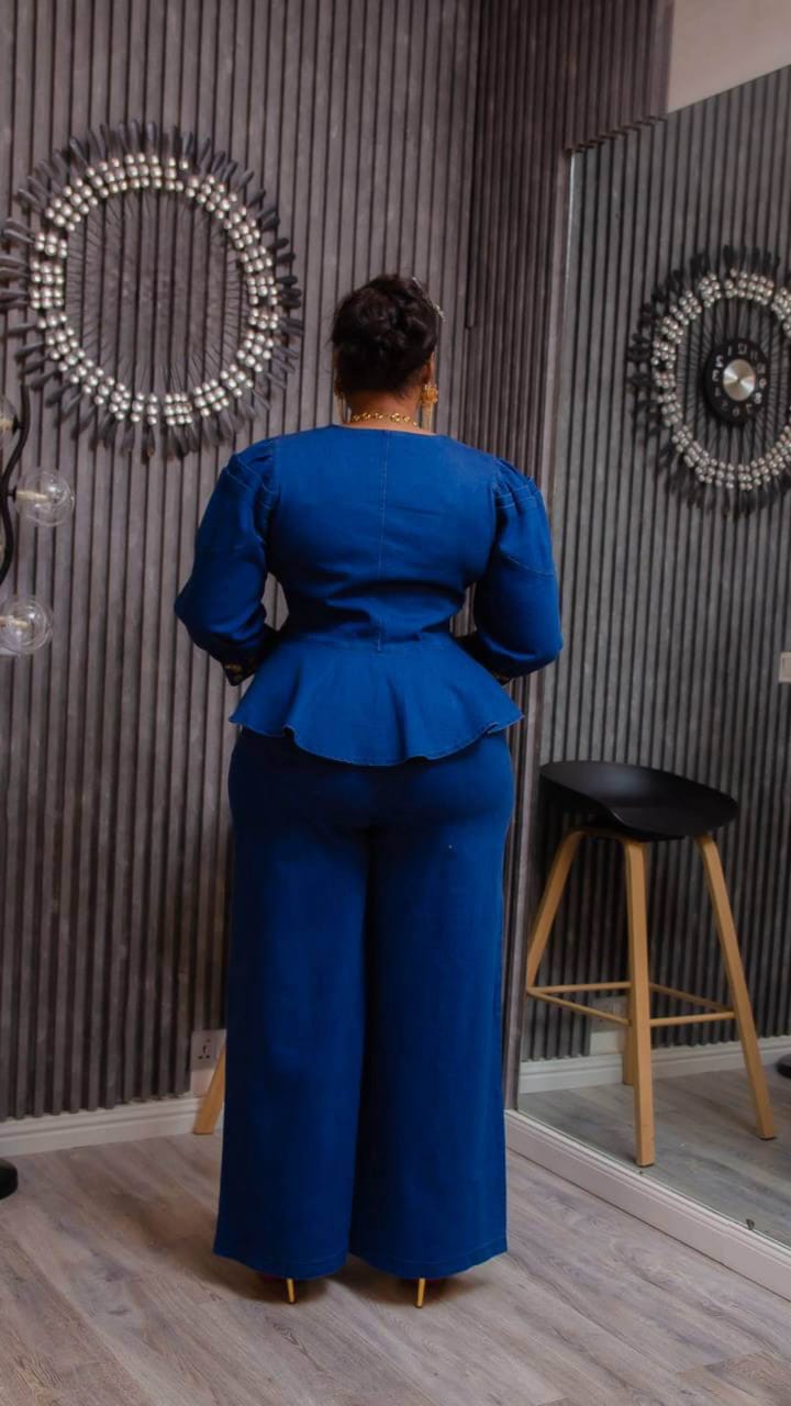 Make a statement in the Royal Azure Embellished Set. This sophisticated two-piece features a beautifully detailed peplum top with a front zip and matching wide-leg pants, both adorned with intricate golden embellishments. Perfect for special occasions where you want to exude elegance and poise.
