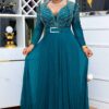 Our “Teal Gala” Embellished Dress is a stunning piece in a rich teal hue, designed to make you stand out with elegance. This fitted midi-length dress features a unique, embellished V-neckline with a delicate keyhole cutout. The long sleeves are adorned with gold studs, which also trail elegantly down the sides of the dress, creating a beautiful and elongating effect.